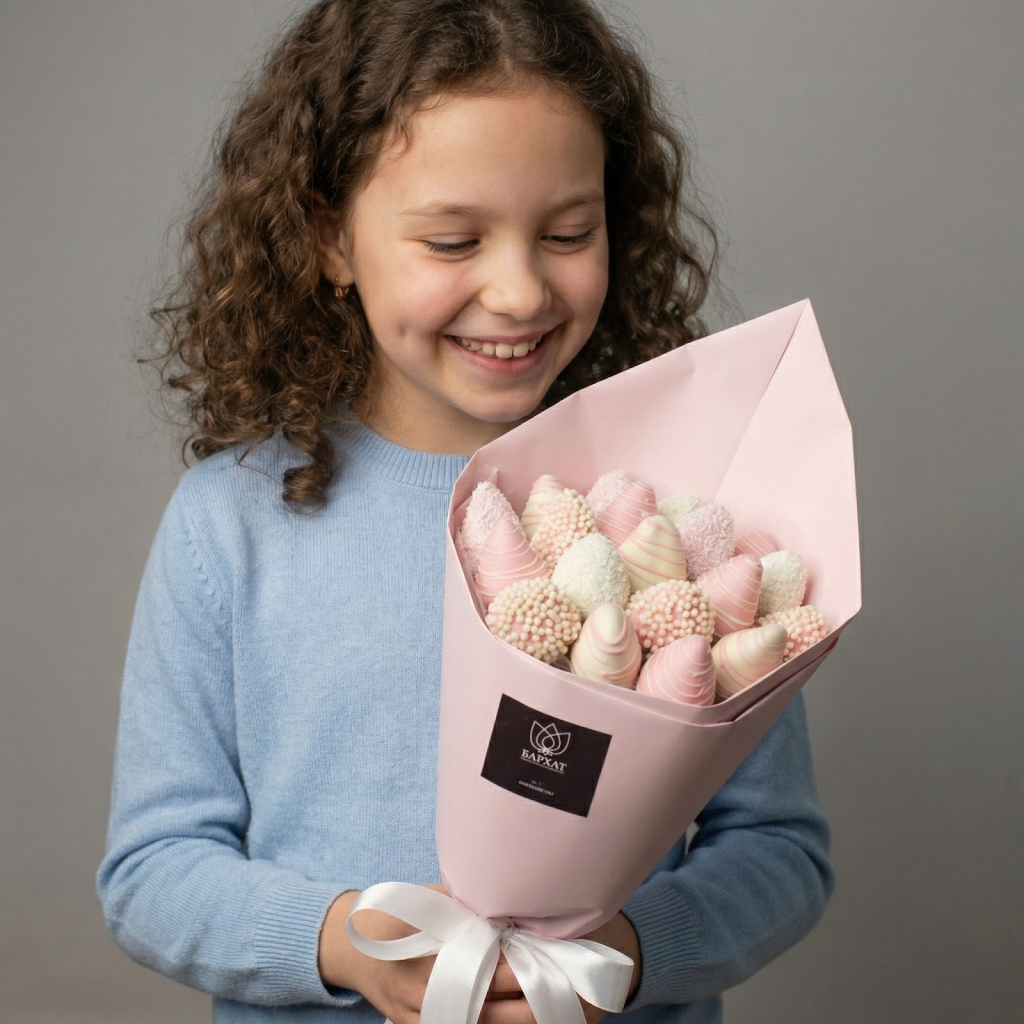 Это модные наборы с цветами и клубникой в шоколаде— отличный способ удивить и порадовать растущую девочку.