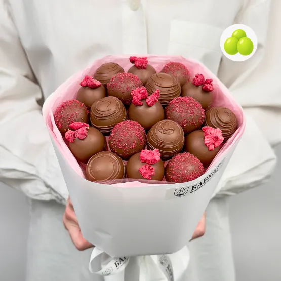 Мы собираем клубничные букеты по весу, а не по штукам. Количество, форма и размер ягод могут отличаться — ведь каждая ягода уникальна.