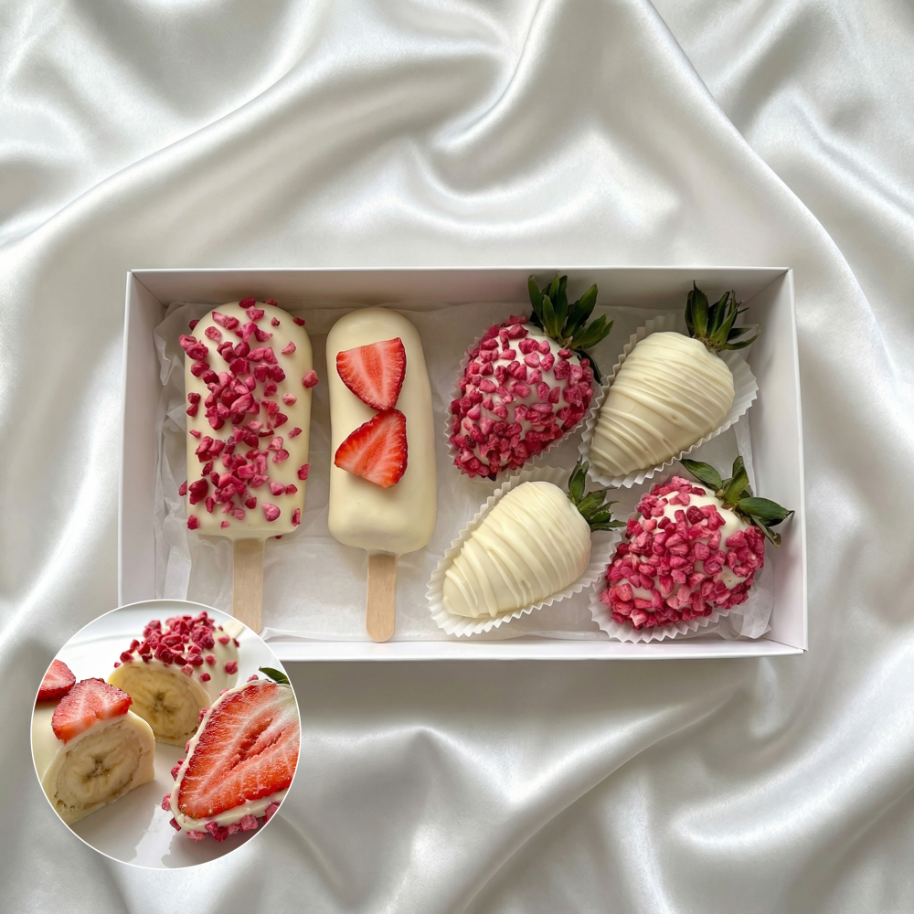 Мы собираем клубничные букеты по весу, а не по штукам. Количество, форма и размер ягод могут отличаться — ведь каждая ягода уникальна.