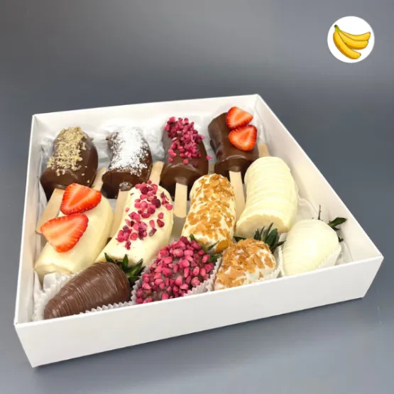Состав: бананы в шоколаде 8 шт., клубника в шоколаде 4 шт.