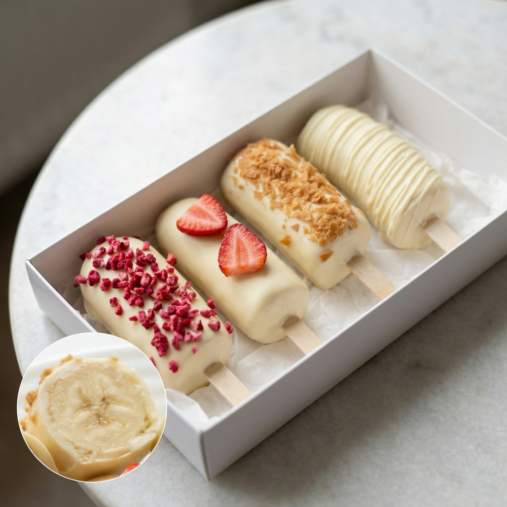 Состав: бананы в шоколаде 4 шт. Свежие бананы в бельгийском шоколаде — идеальный способ выразить чувства: ко дню рождения, годовщине, 8 Марта, 14 Февраля, Дню матери, Дню учителя, Дню бабушки и дедушки или просто в знак внимания и заботы. Фирменная открытка-инструкция по хранению — в подарок. Коробочка бананов в шоколаде — отличный подарок бабушке, маме, любимой женщине, жене, подруге, сестре, друзьям и коллеге.
