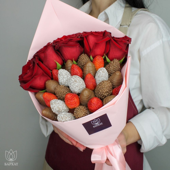 Этот букет — идеальный способ выразить чувства: ко дню рождения, годовщине, 8 Марта, 14 Февраля, Дню матери, Дню учителя, Дню бабушки и дедушки или просто в знак внимания и заботы. Букет из клубники и цветов — съедобный букет — отличный подарок бабушке, маме, любимой женщине, жене, подруге, сестре, друзьям и коллеге.