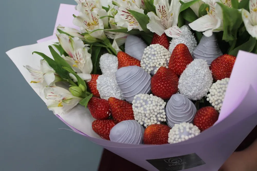 Мы собираем клубничные букеты по весу, а не по штукам. Количество, форма и размер ягод могут отличаться — ведь каждая ягода уникальна.
