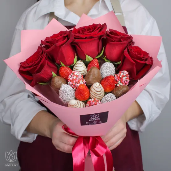 Состав: клубника в шоколаде 110 г, клубника без шоколада 110 г, роза одноголовая 5 шт. Букет из свежей клубники в бельгийском шоколаде и живых цветов. Клубника держится на каркасе из шпажек. Ягода отделена от цветов прозрачной пленкой. Готовый букет упаковывается в прозрачную слюду. Фирменная открытка-инструкция по хранению — в подарок. Этот букет — идеальный способ выразить чувства: ко дню рождения, годовщине, 8 Марта, 14 Февраля, Дню матери, Дню учителя, Дню бабушки и дедушки или просто в знак внимания и заботы. Букет из клубники и цветов — съедобный букет — отличный подарок бабушке, маме, любимой женщине, жене, подруге, сестре, друзьям и коллеге.