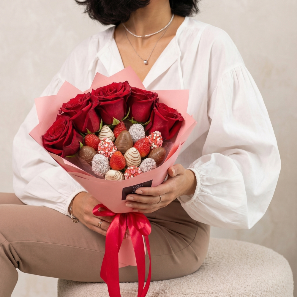Мы собираем клубничные букеты по весу, а не по штукам. Количество, форма и размер ягод могут отличаться — ведь каждая ягода уникальна.