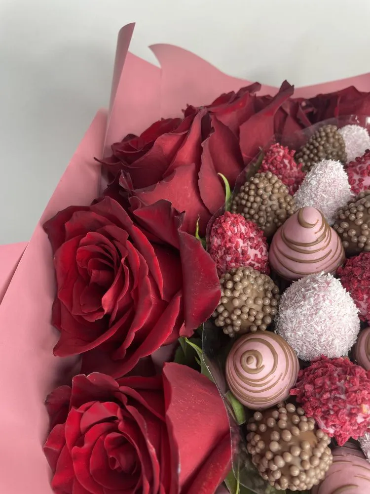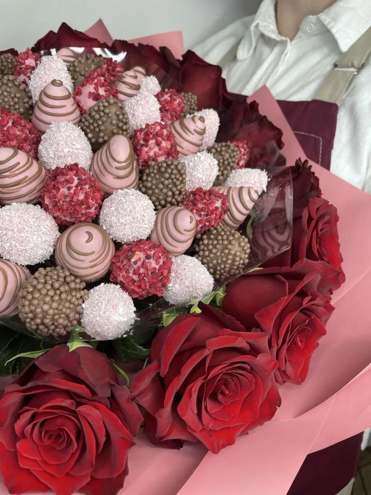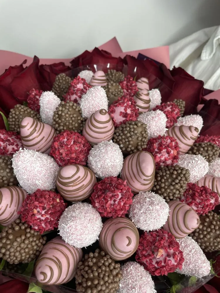 Мы собираем клубничные букеты по весу, а не по штукам. Количество, форма и размер ягод могут отличаться — ведь каждая ягода уникальна.