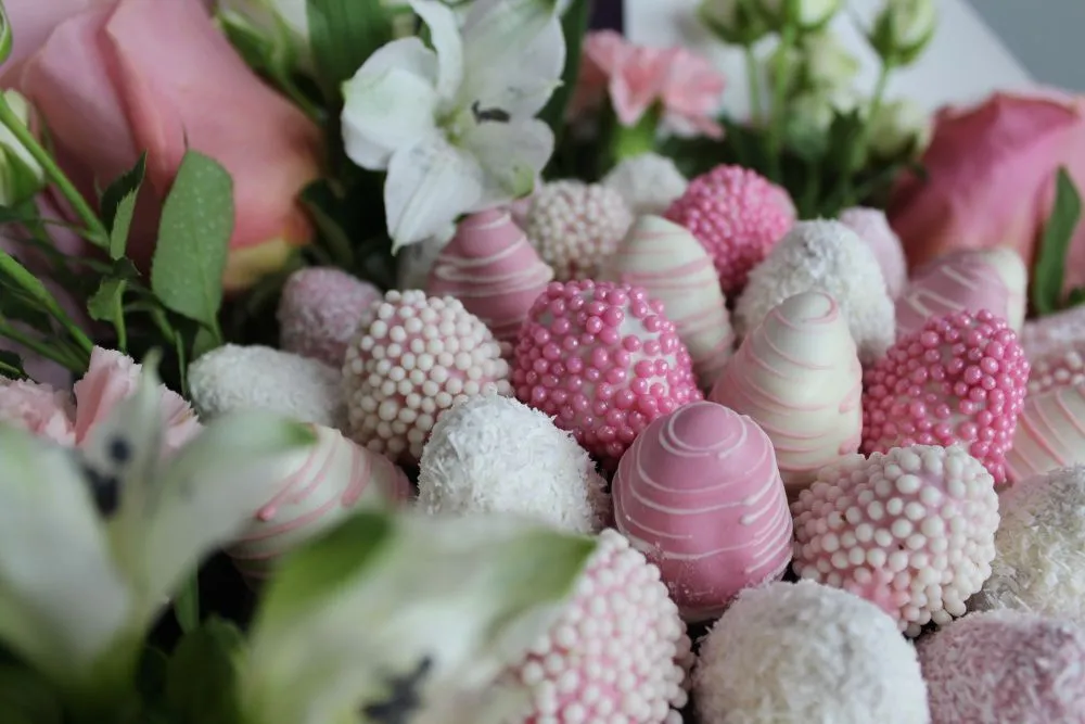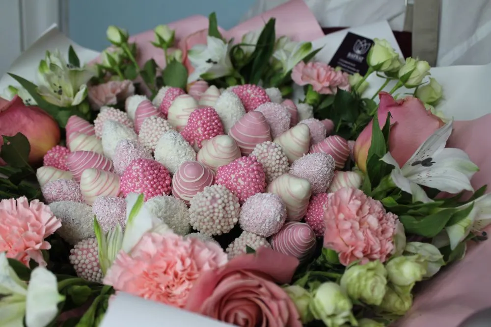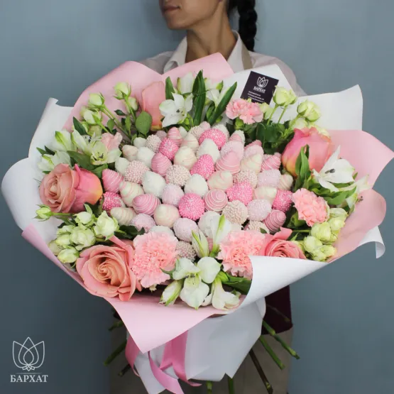 Мы собираем клубничные букеты по весу, а не по штукам. Количество, форма и размер ягод могут отличаться — ведь каждая ягода уникальна.