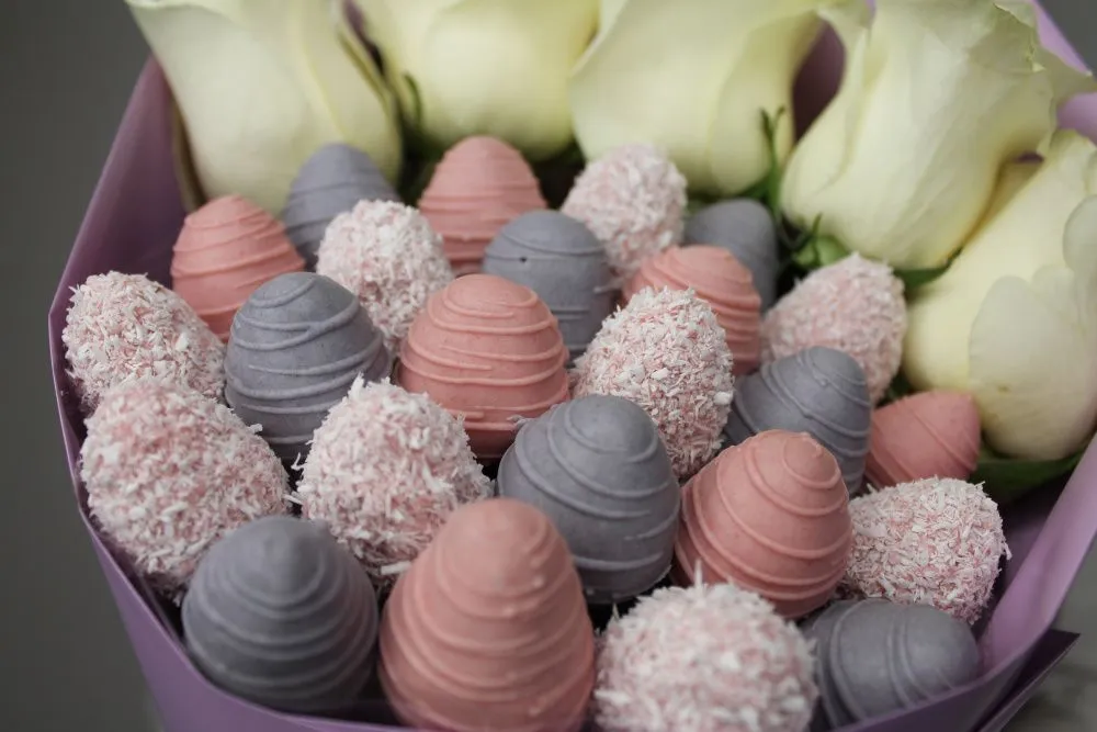 Мы собираем клубничные букеты по весу, а не по штукам. Количество, форма и размер ягод могут отличаться — ведь каждая ягода уникальна.