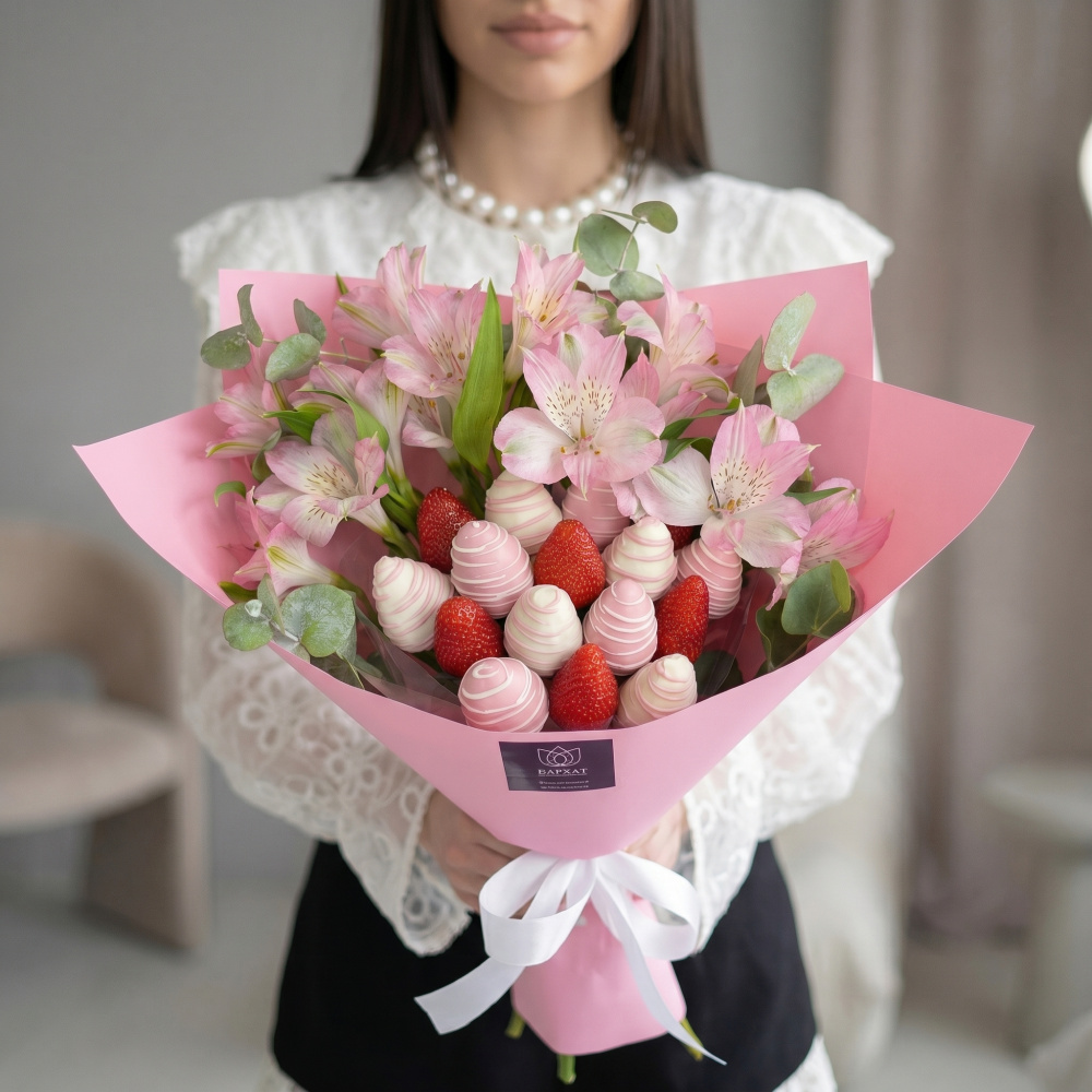 Мы собираем клубничные букеты по весу, а не по штукам. Количество, форма и размер ягод могут отличаться — ведь каждая ягода уникальна.