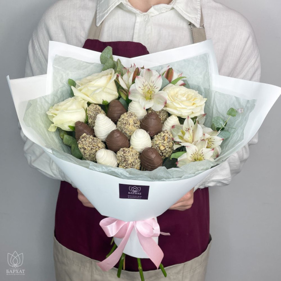 Этот букет — идеальный способ выразить чувства: ко дню рождения, годовщине, 8 Марта, 14 Февраля, Дню матери, Дню учителя, Дню бабушки и дедушки или просто в знак внимания и заботы. Букет из клубники и цветов — съедобный букет — отличный подарок бабушке, маме, любимой женщине, жене, подруге, сестре, друзьям и коллеге.