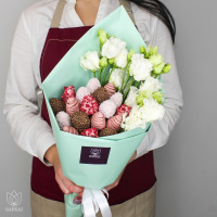 Мы собираем клубничные букеты по весу, а не по штукам. Количество, форма и размер ягод могут отличаться — ведь каждая ягода уникальна.