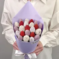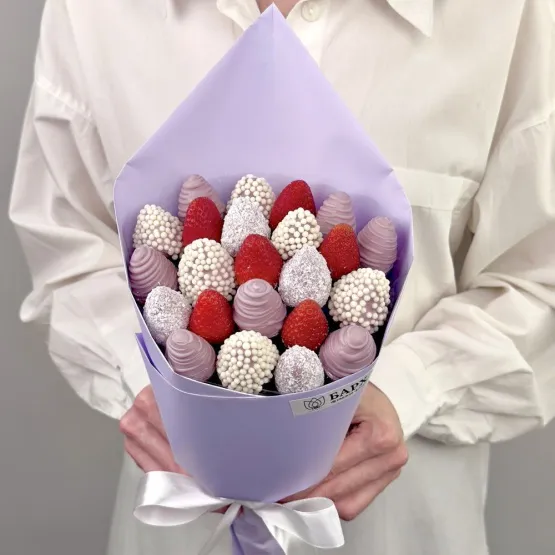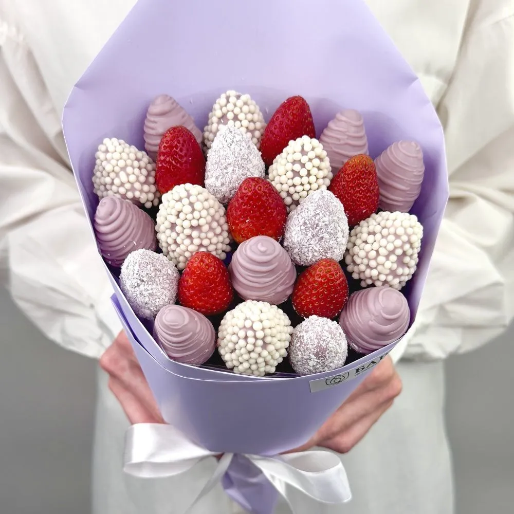 Мы собираем клубничные букеты по весу, а не по штукам. Количество, форма и размер ягод могут отличаться — ведь каждая ягода уникальна.