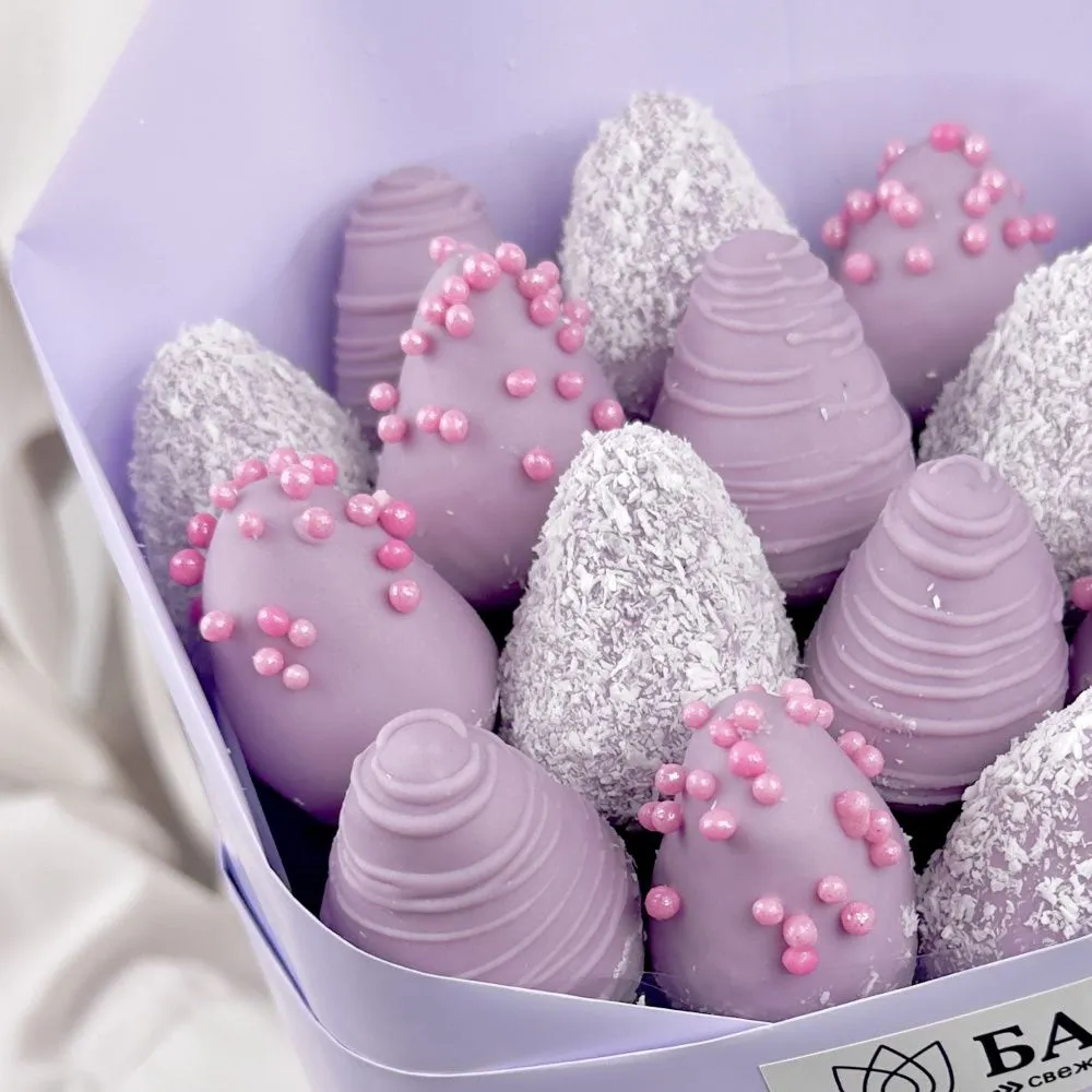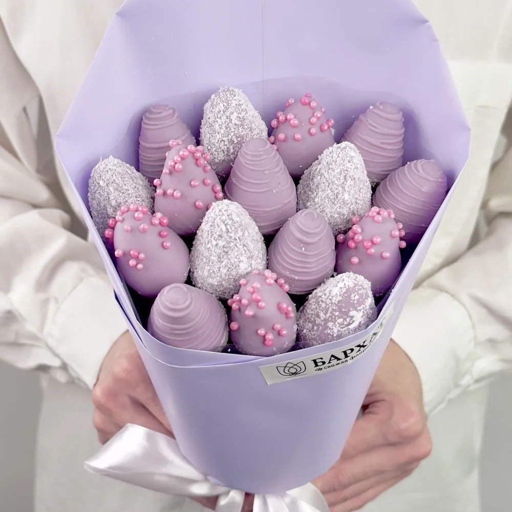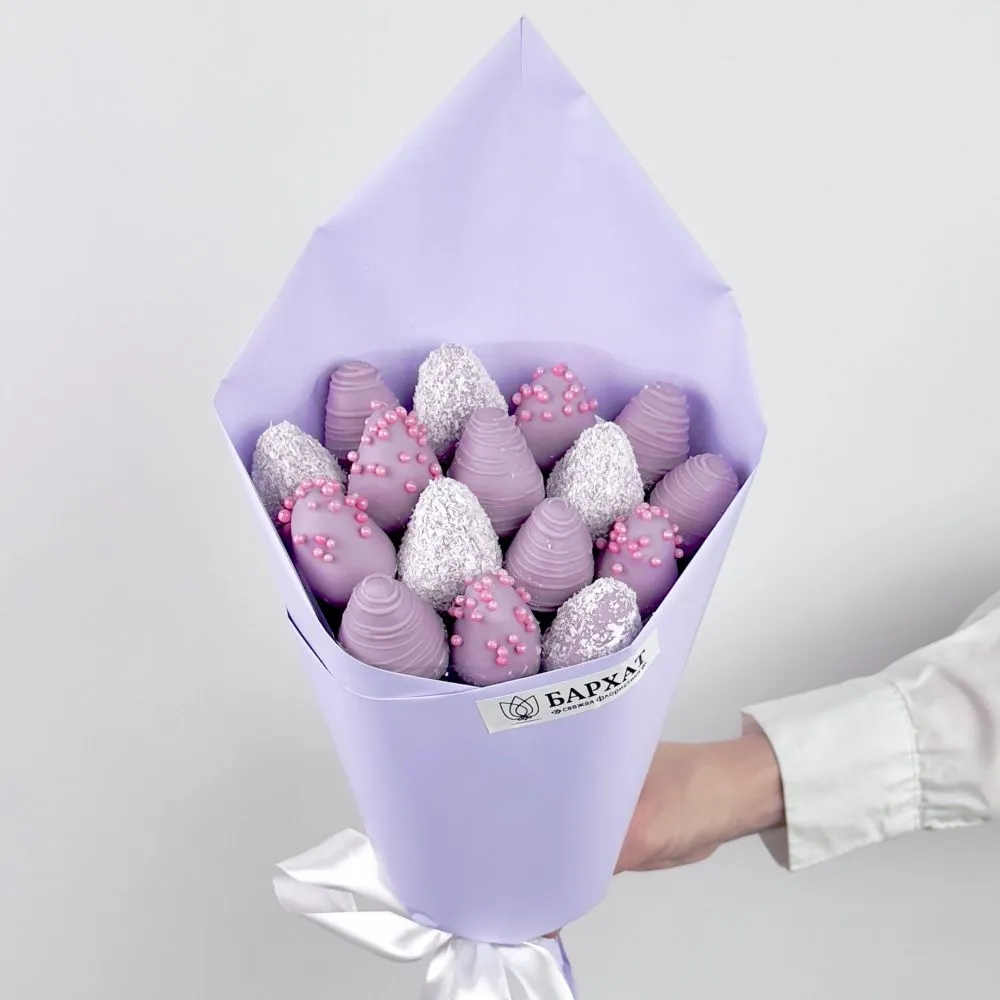 Мы собираем клубничные букеты по весу, а не по штукам. Количество, форма и размер ягод могут отличаться — ведь каждая ягода уникальна.