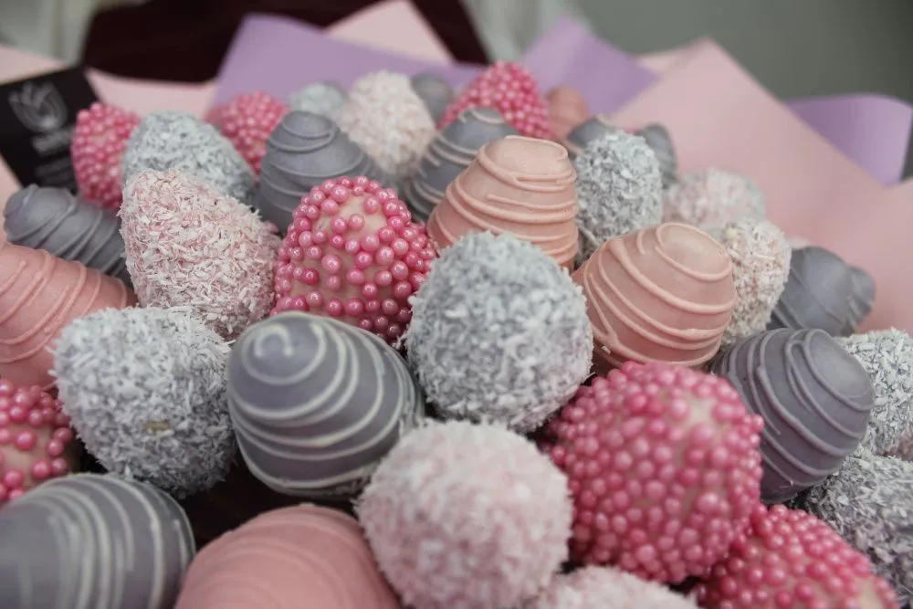 Мы собираем клубничные букеты по весу, а не по штукам. Количество, форма и размер ягод могут отличаться — ведь каждая ягода уникальна.