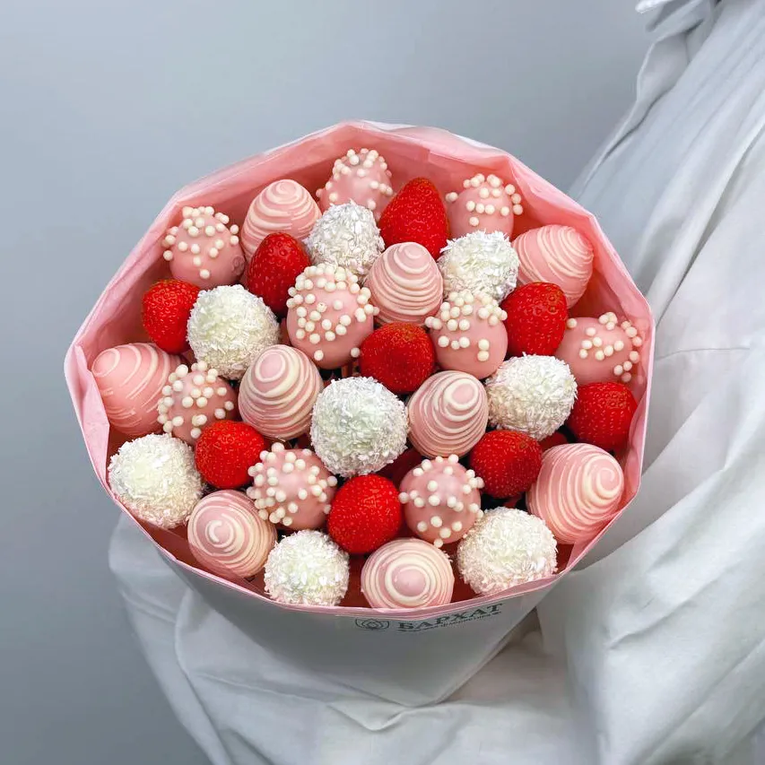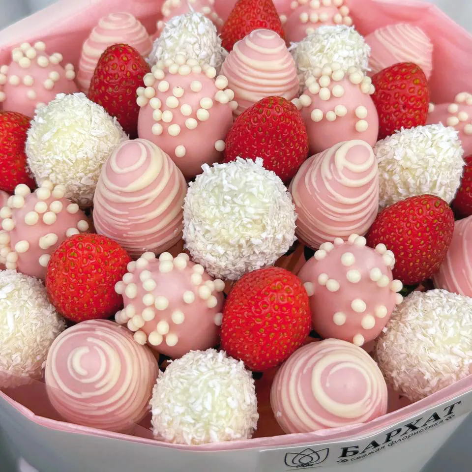 *Обратите внимание: изображение в карточке товара носит иллюстративный характер — реальный букет может незначительно отличаться от фото (например, по размеру клубники, форме и сборке). Точные размеры букета указаны в карточке товара.