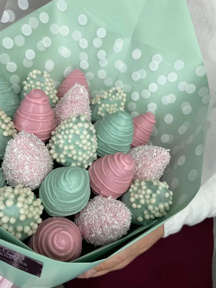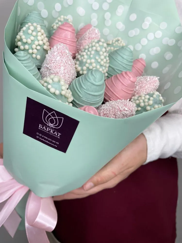 Мы собираем клубничные букеты по весу, а не по штукам. Количество, форма и размер ягод могут отличаться — ведь каждая ягода уникальна.