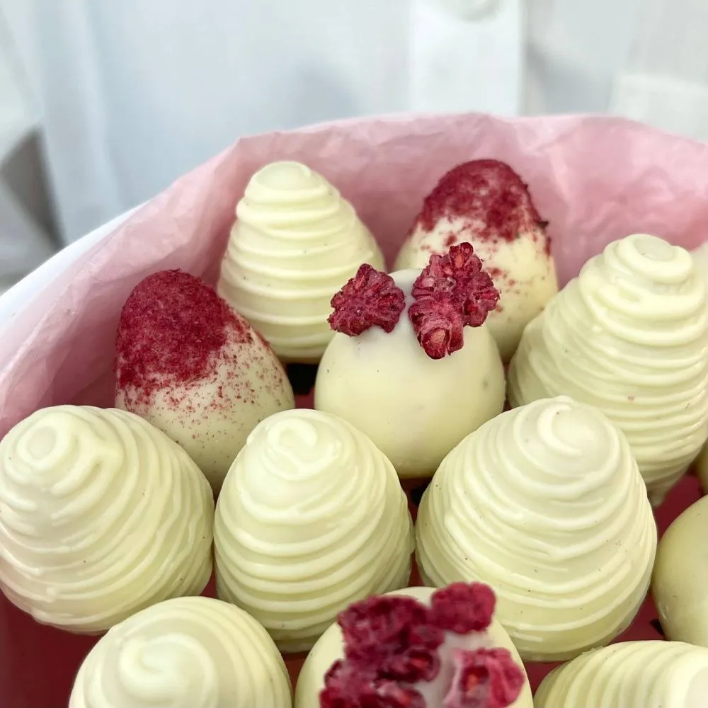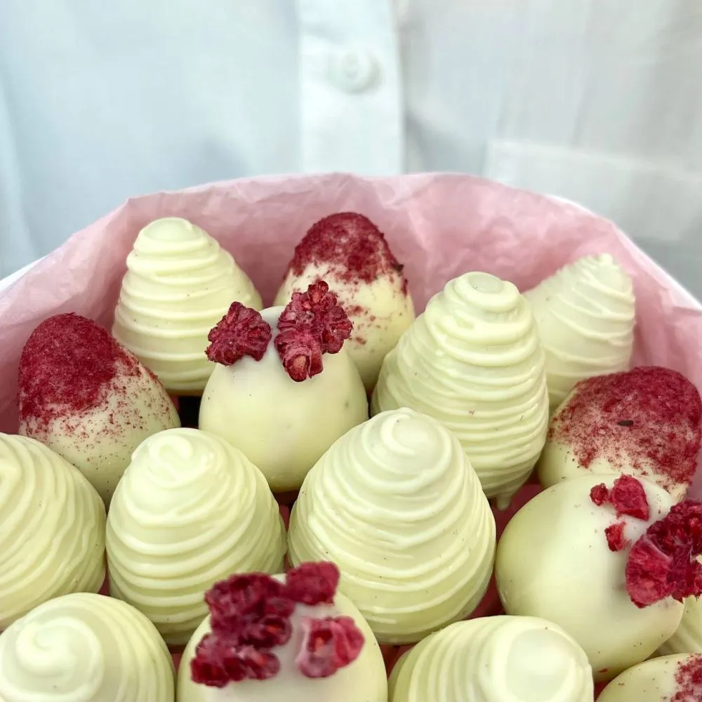 Мы собираем клубничные букеты по весу, а не по штукам. Количество, форма и размер ягод могут отличаться — ведь каждая ягода уникальна.