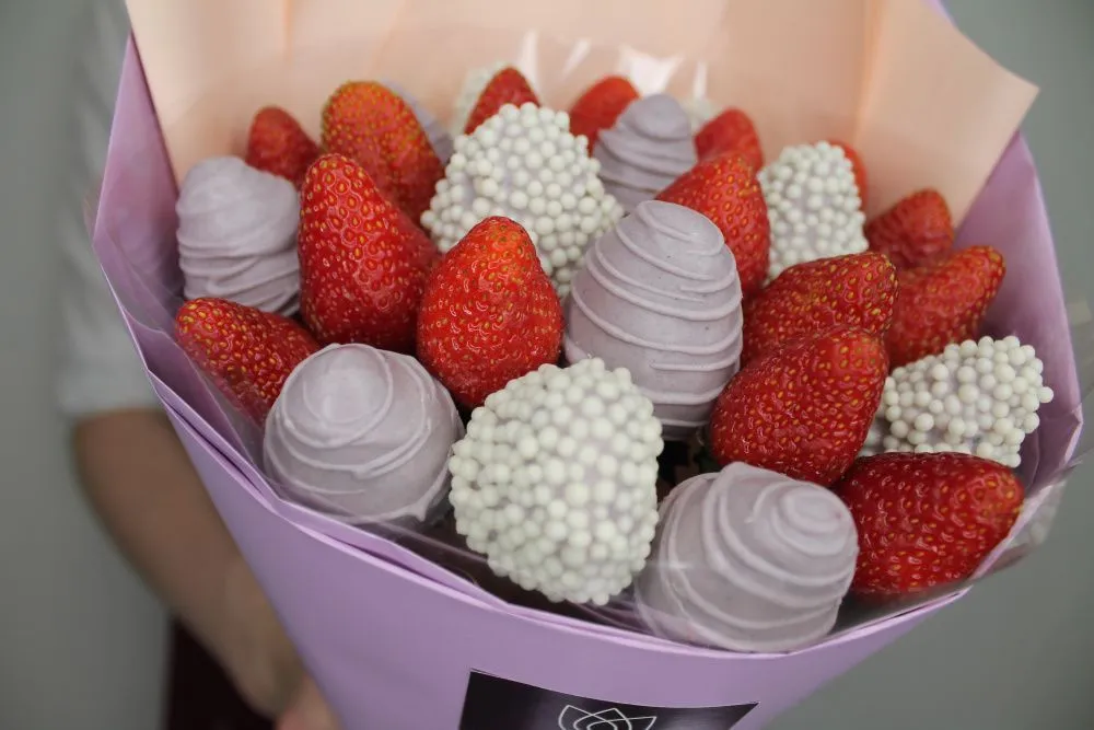Мы собираем клубничные букеты по весу, а не по штукам. Количество, форма и размер ягод могут отличаться — ведь каждая ягода уникальна.