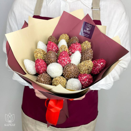 *Обратите внимание: изображение в карточке товара носит иллюстративный характер — реальный букет может незначительно отличаться от фото (например, по размеру клубники, форме и сборке). Точные размеры букета указаны в карточке товара.