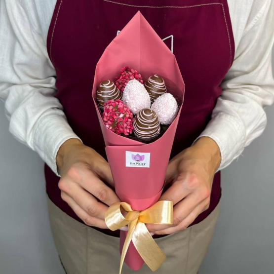 *Обратите внимание: изображение в карточке товара носит иллюстративный характер — реальный букет может незначительно отличаться от фото (например, по размеру клубники, форме и сборке). Точные размеры букета указаны в карточке товара.