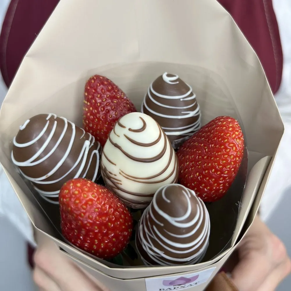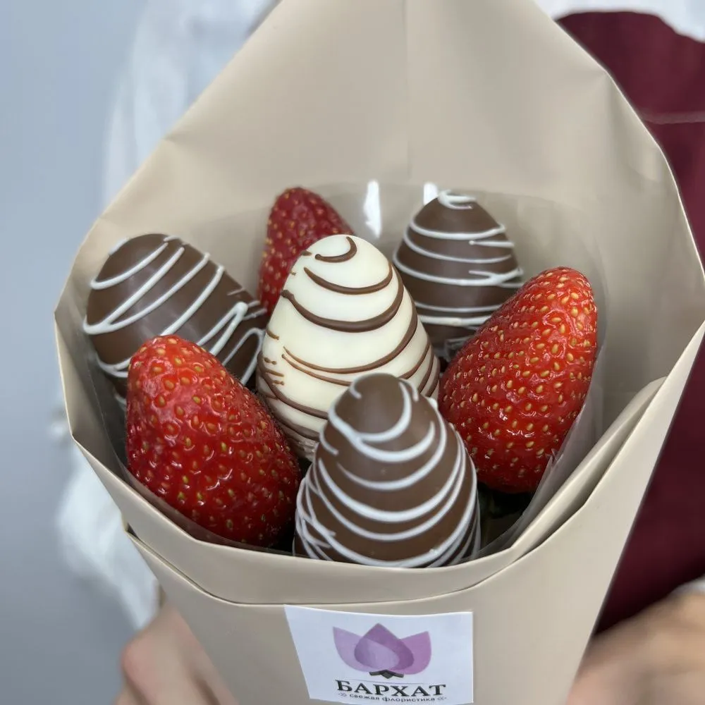 Мы собираем клубничные букеты по весу, а не по штукам. Количество, форма и размер ягод могут отличаться — ведь каждая ягода уникальна.