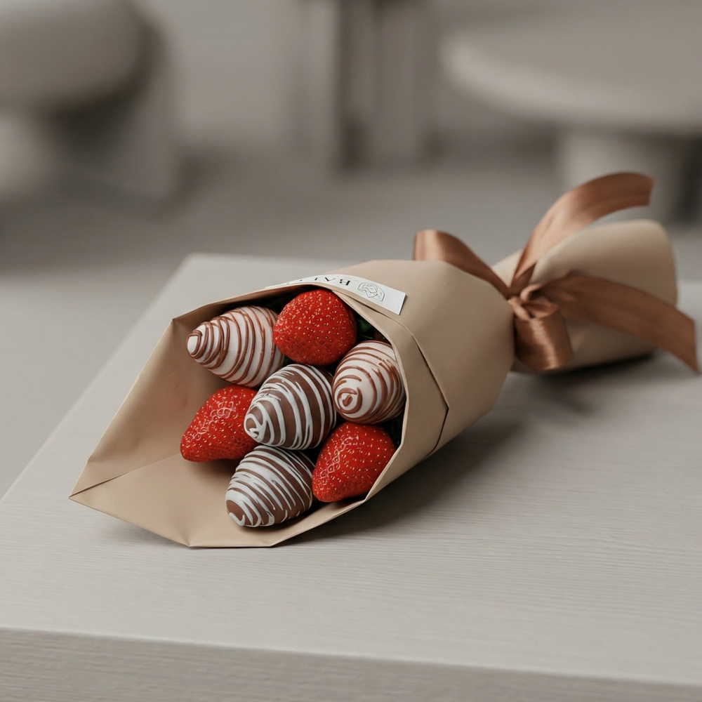 *Обратите внимание: изображение в карточке товара носит иллюстративный характер — реальный букет может незначительно отличаться от фото (например, по размеру клубники, форме и сборке). Точные размеры букета указаны в карточке товара.