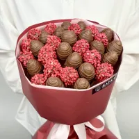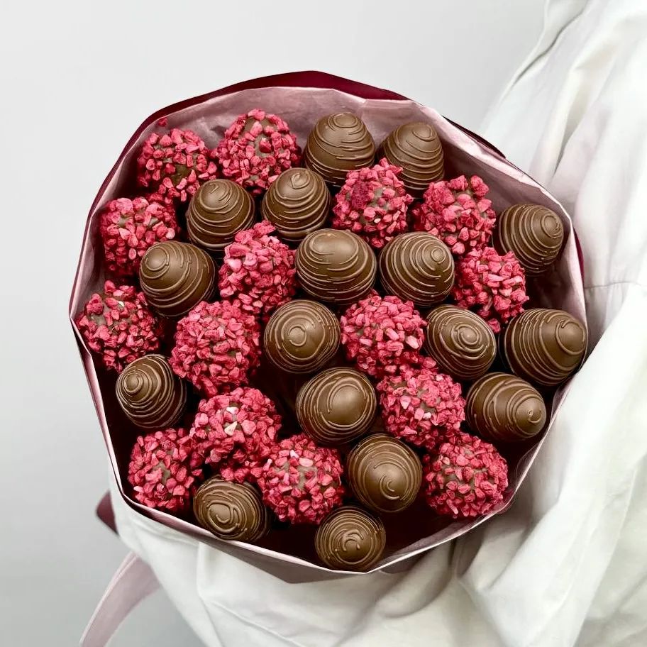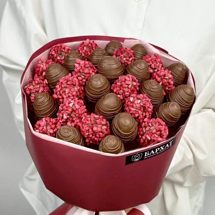 Мы собираем клубничные букеты по весу, а не по штукам. Количество, форма и размер ягод могут отличаться — ведь каждая ягода уникальна.