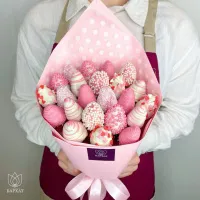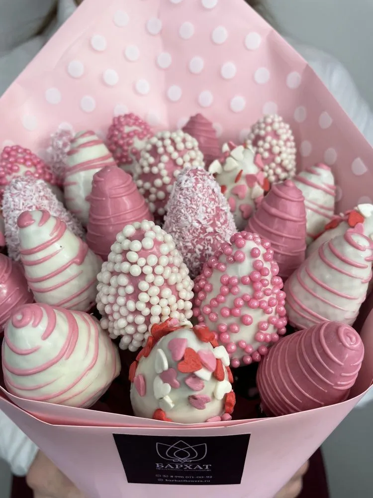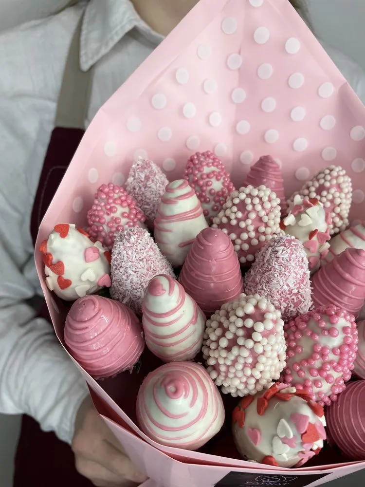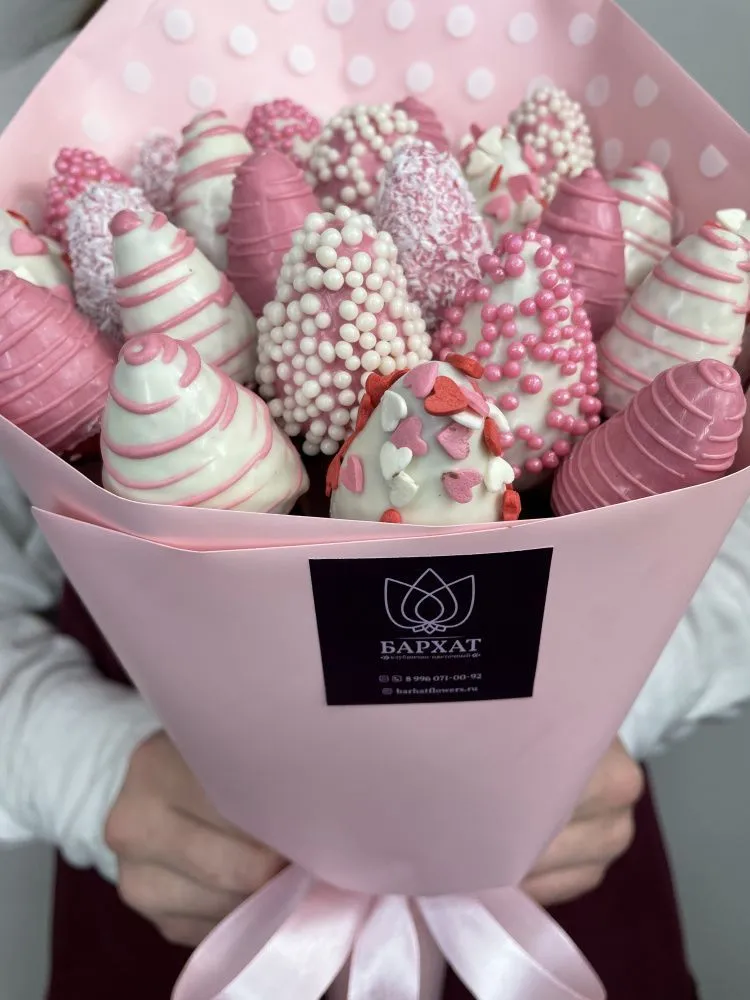 Мы собираем клубничные букеты по весу, а не по штукам. Количество, форма и размер ягод могут отличаться — ведь каждая ягода уникальна.