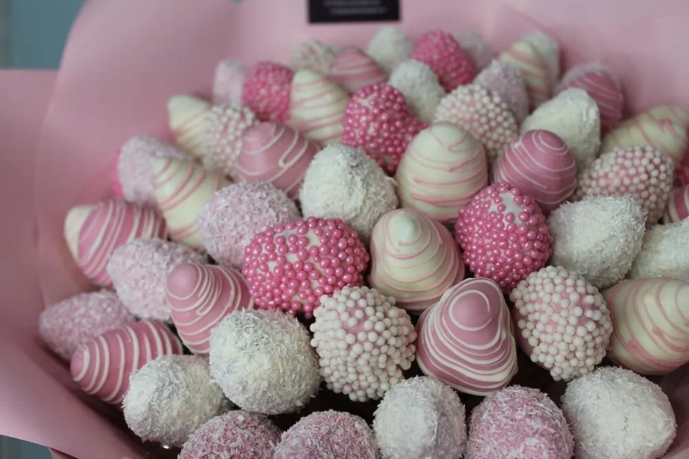 Мы собираем клубничные букеты по весу, а не по штукам. Количество, форма и размер ягод могут отличаться — ведь каждая ягода уникальна.