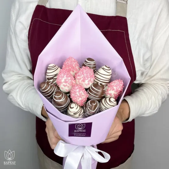 Мы собираем клубничные букеты по весу, а не по штукам. Количество, форма и размер ягод могут отличаться — ведь каждая ягода уникальна.