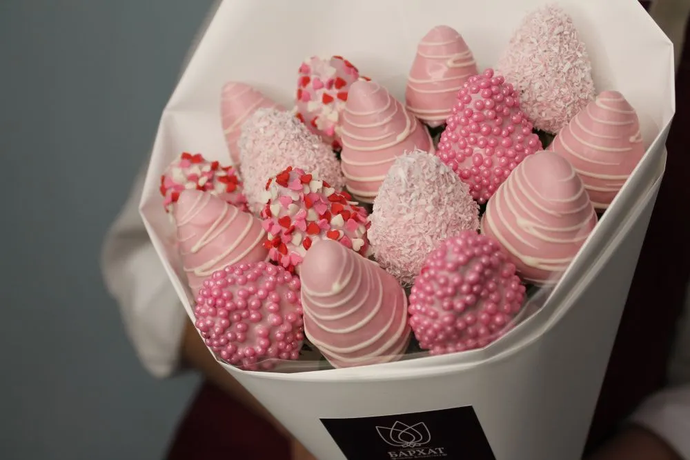 Мы собираем клубничные букеты по весу, а не по штукам. Количество, форма и размер ягод могут отличаться — ведь каждая ягода уникальна.