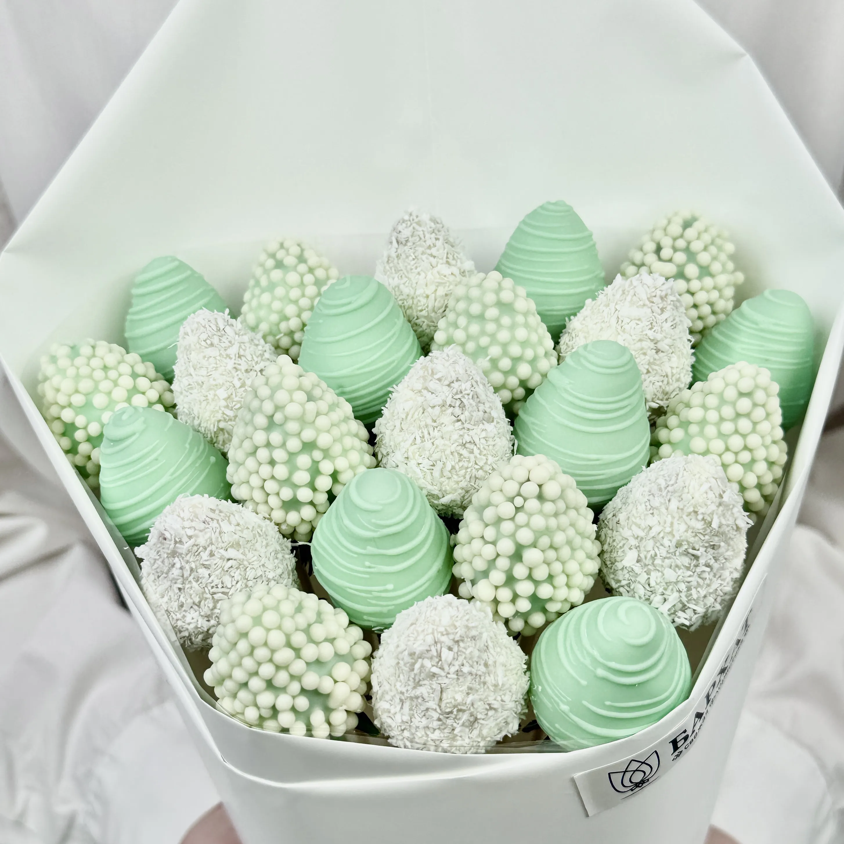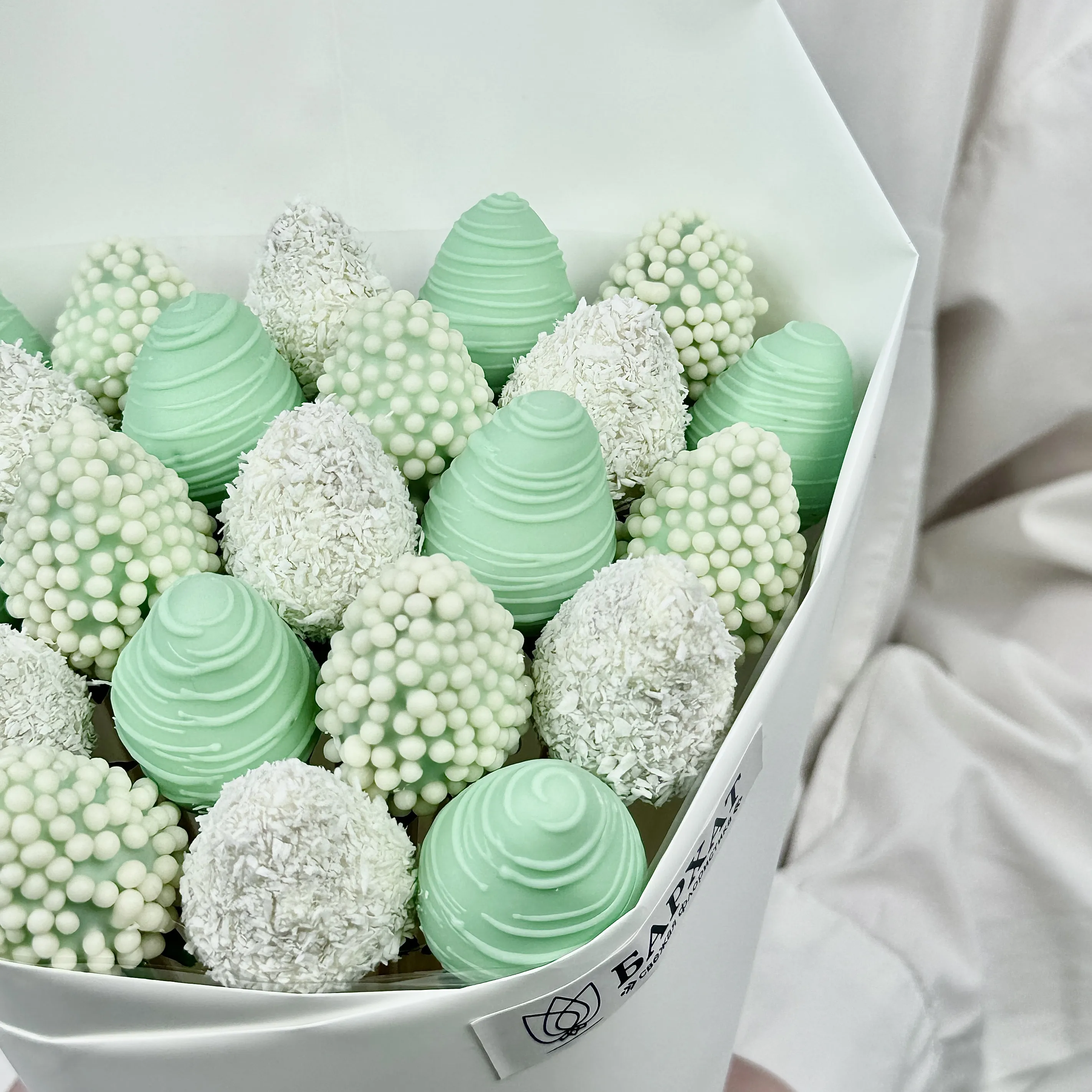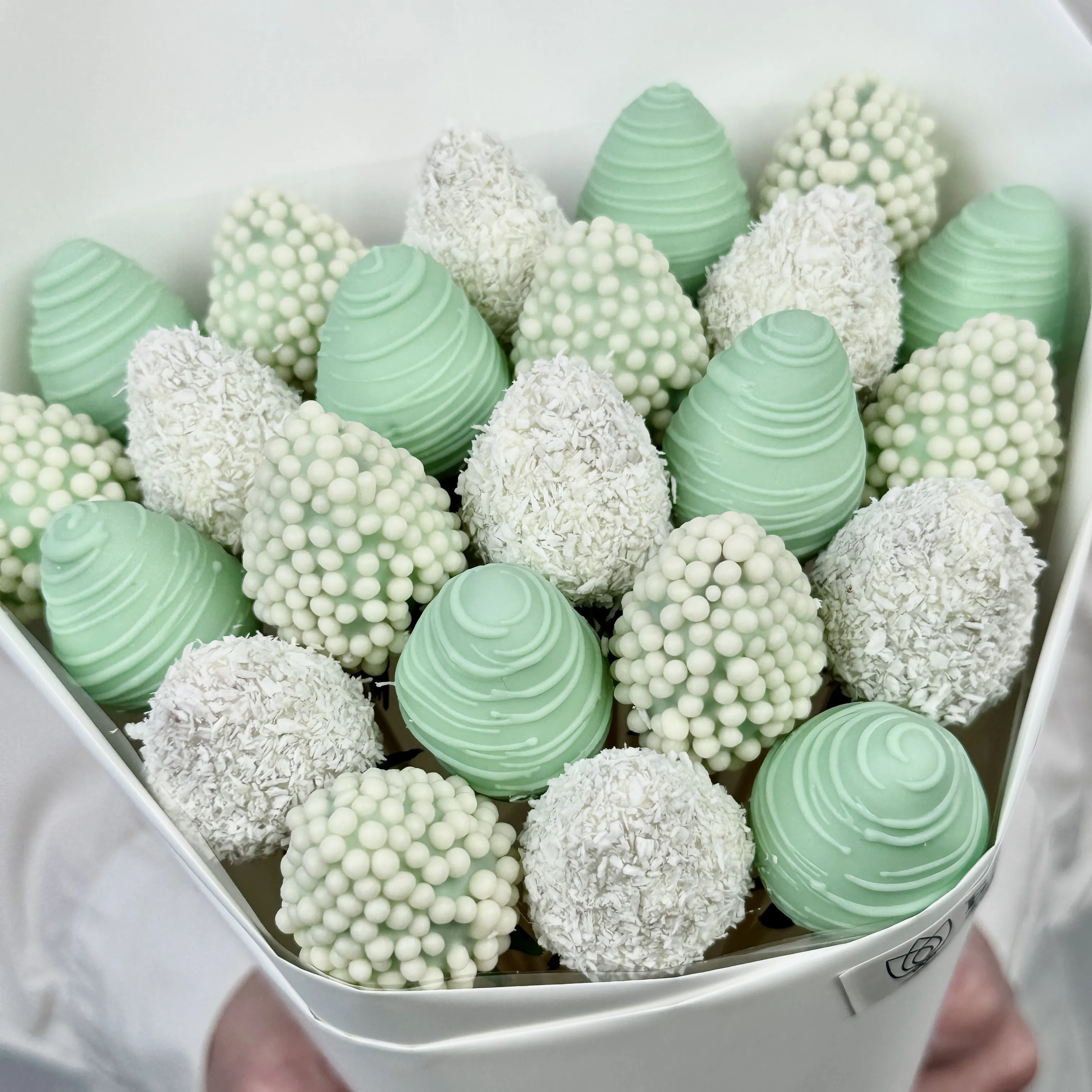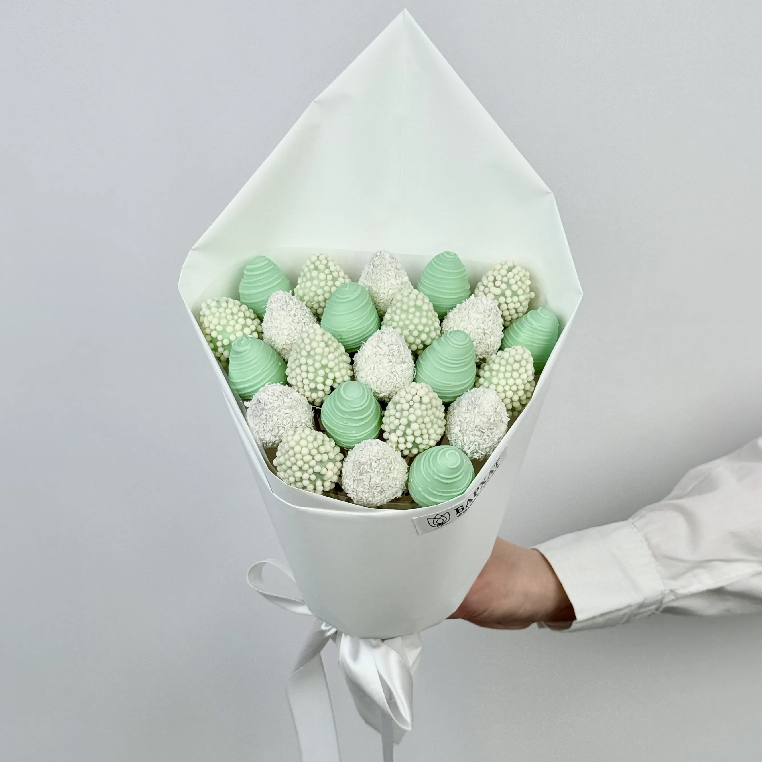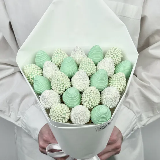 Мы собираем клубничные букеты по весу, а не по штукам. Количество, форма и размер ягод могут отличаться — ведь каждая ягода уникальна.