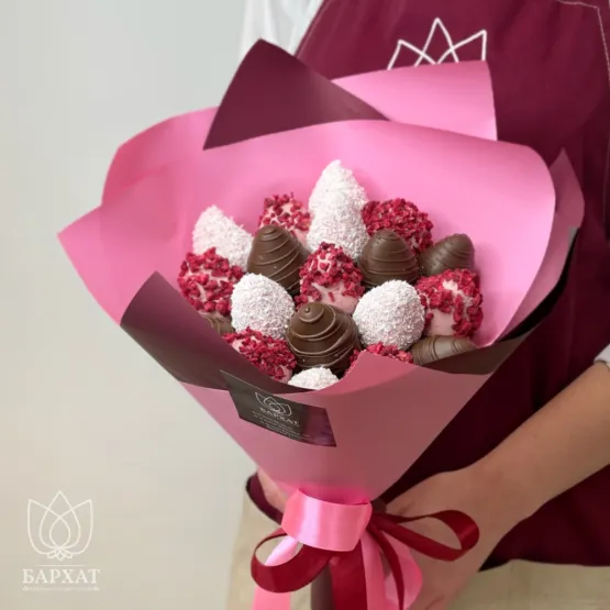 Мы собираем клубничные букеты по весу, а не по штукам. Количество, форма и размер ягод могут отличаться — ведь каждая ягода уникальна.
