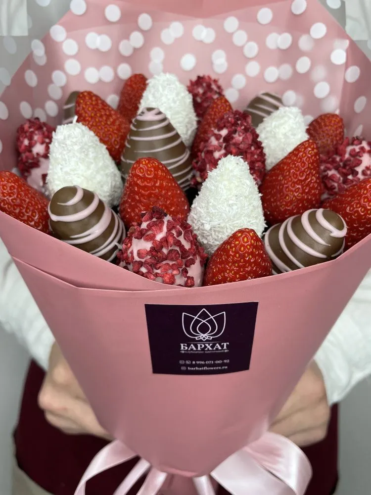 Мы собираем клубничные букеты по весу, а не по штукам. Количество, форма и размер ягод могут отличаться — ведь каждая ягода уникальна.