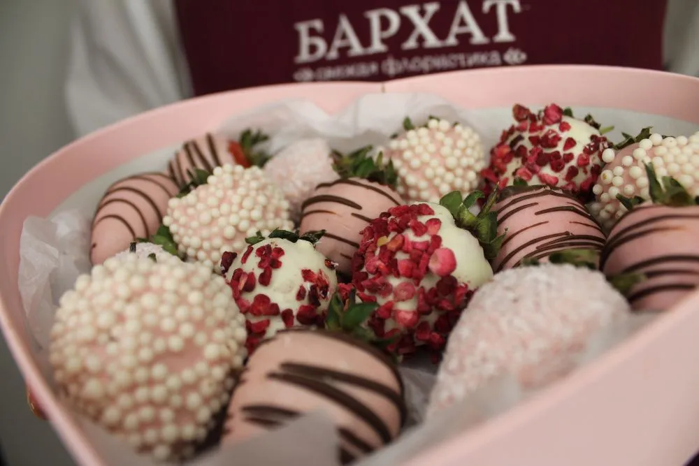 Мы собираем клубничные букеты по весу, а не по штукам. Количество, форма и размер ягод могут отличаться — ведь каждая ягода уникальна.