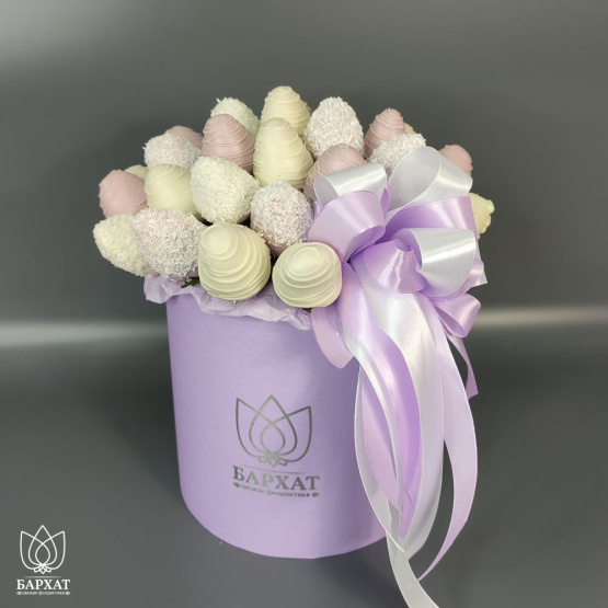 Мы собираем клубничные букеты по весу, а не по штукам. Количество, форма и размер ягод могут отличаться — ведь каждая ягода уникальна.