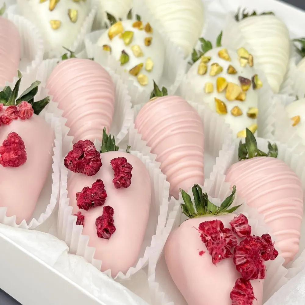 Мы собираем клубничные букеты по весу, а не по штукам. Количество, форма и размер ягод могут отличаться — ведь каждая ягода уникальна.
