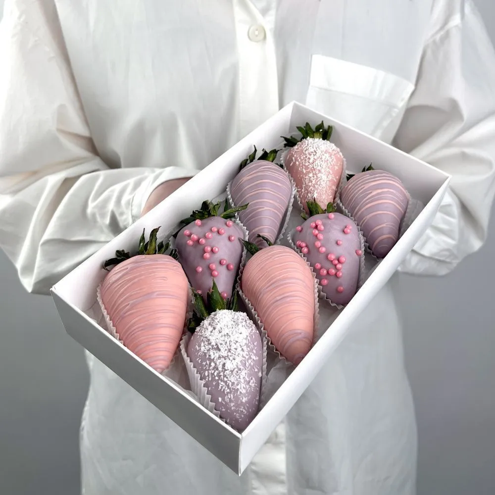 Мы собираем клубничные букеты по весу, а не по штукам. Количество, форма и размер ягод могут отличаться — ведь каждая ягода уникальна.