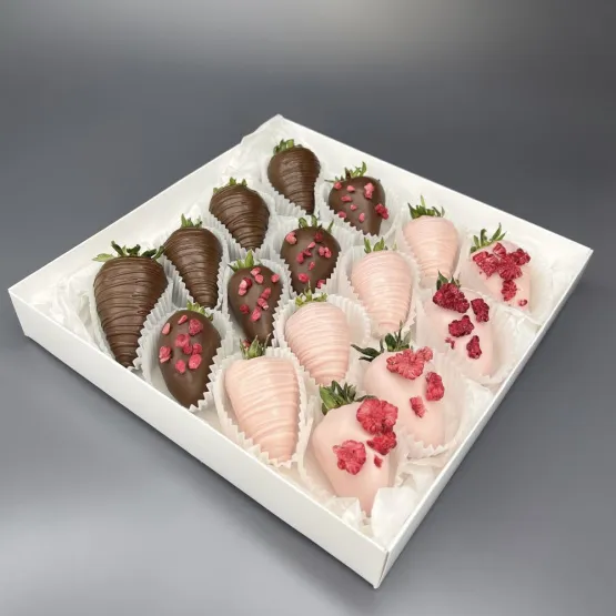 Мы собираем клубничные букеты по весу, а не по штукам. Количество, форма и размер ягод могут отличаться — ведь каждая ягода уникальна.