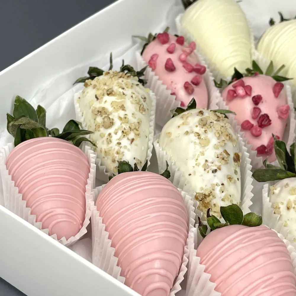 Мы собираем клубничные букеты по весу, а не по штукам. Количество, форма и размер ягод могут отличаться — ведь каждая ягода уникальна.
