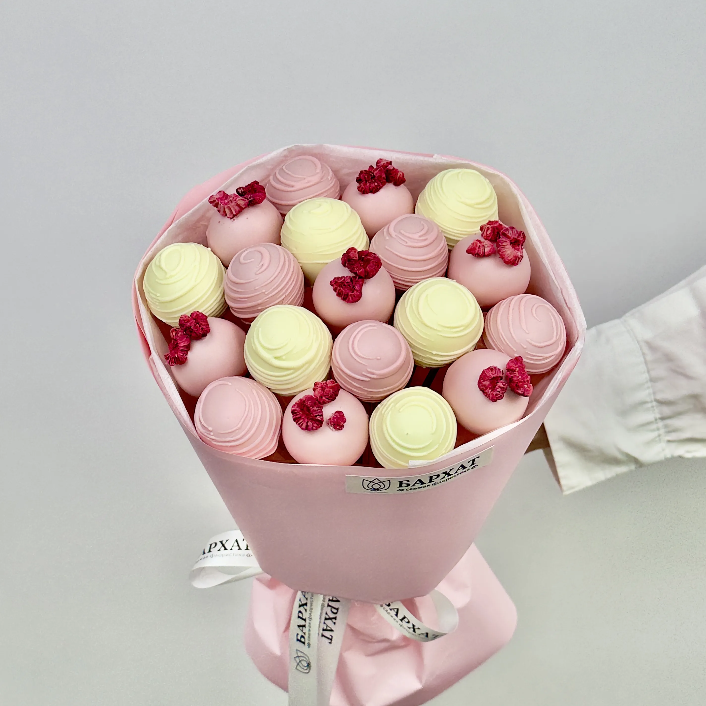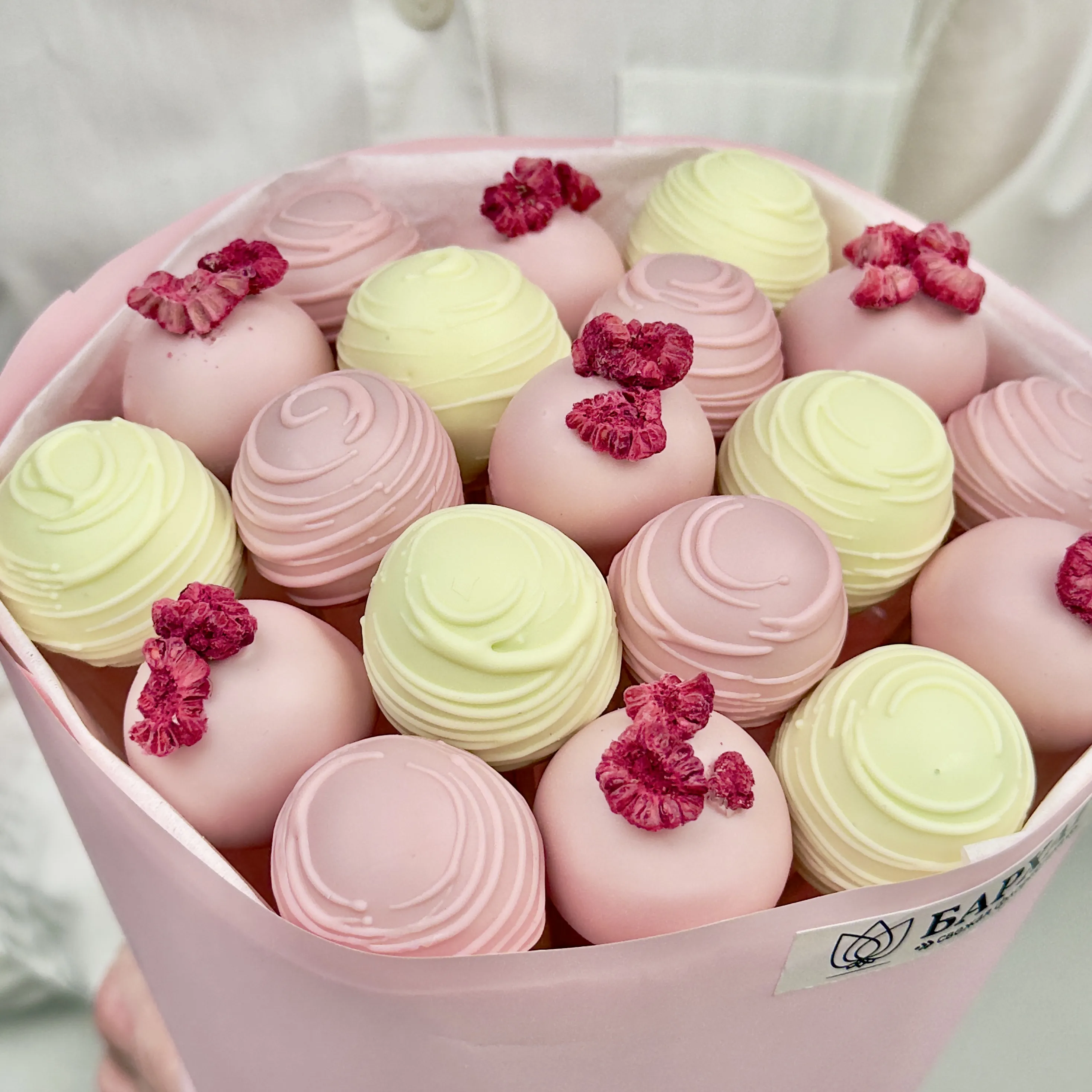 Мы собираем клубничные букеты по весу, а не по штукам. Количество, форма и размер ягод могут отличаться — ведь каждая ягода уникальна.