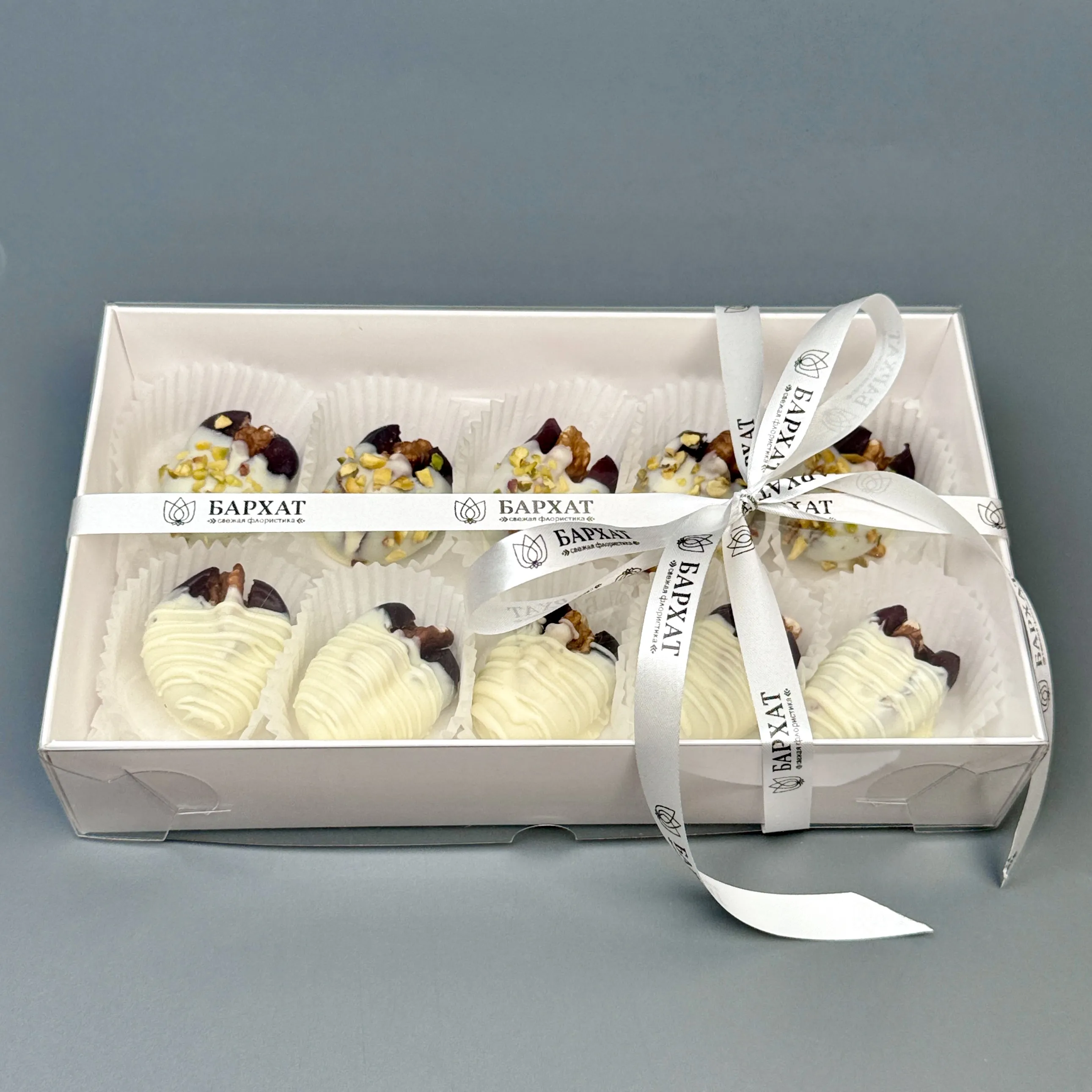 Мы собираем клубничные букеты по весу, а не по штукам. Количество, форма и размер ягод могут отличаться — ведь каждая ягода уникальна.