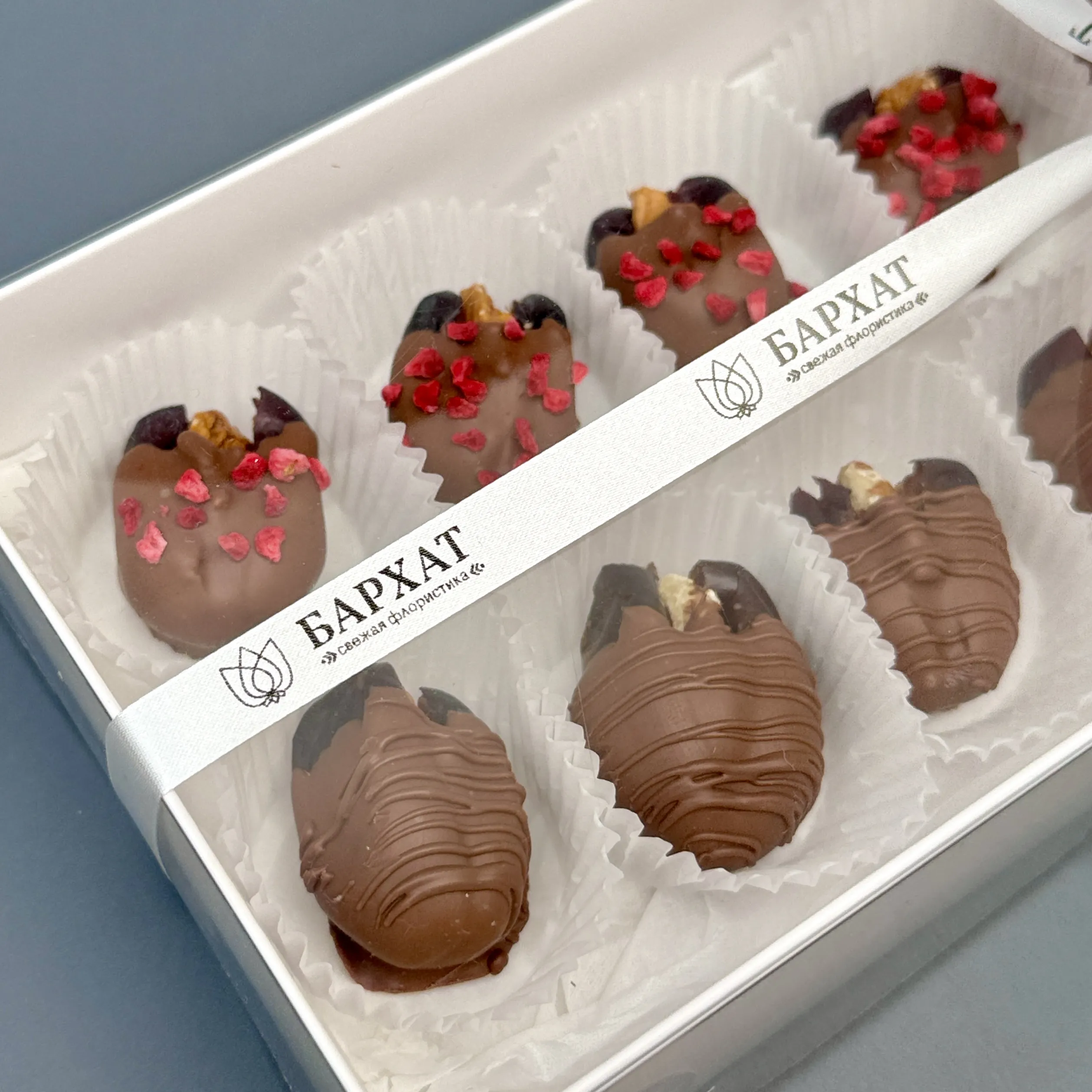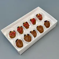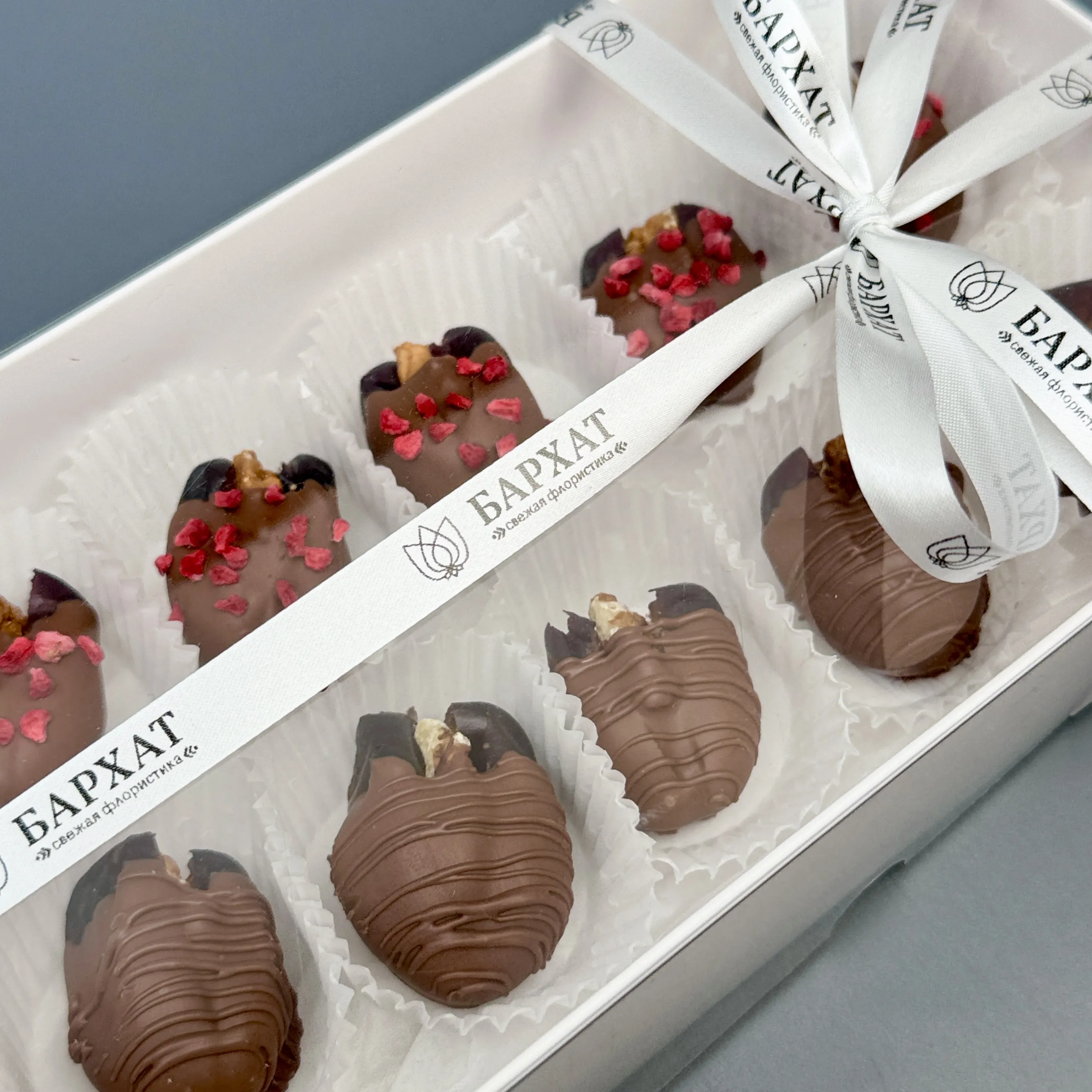 Мы собираем клубничные букеты по весу, а не по штукам. Количество, форма и размер ягод могут отличаться — ведь каждая ягода уникальна.