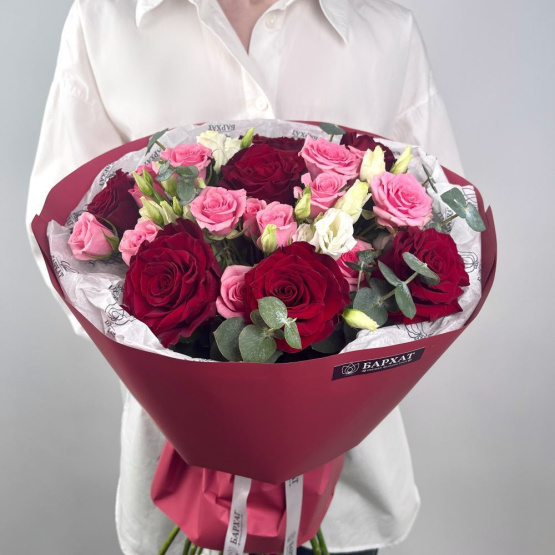 Состав: эустома 3 шт., роза одноголовая 7 шт., роза кустовая 3 шт., эвкалипт 2 шт. Букет из свежих цветов — идеальный способ выразить чувства: ко дню рождения, годовщине, 8 Марта, 14 Февраля, Дню матери, Дню учителя, Дню бабушки и дедушки или просто в знак внимания и заботы. Фирменная открытка-инструкция по хранению — в подарок. Цветочный букет — отличный подарок бабушке, маме, любимой женщине, жене, подруге, сестре, друзьям и коллеге.