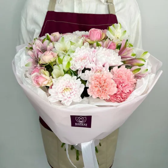 Альстромерия белая , Альстромерия розовая, Роза кустовая розовая , Хризантема розовая, Гвоздика розовая