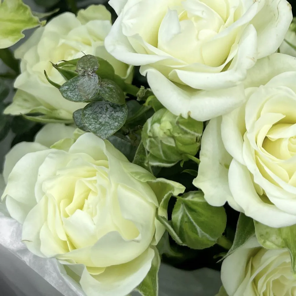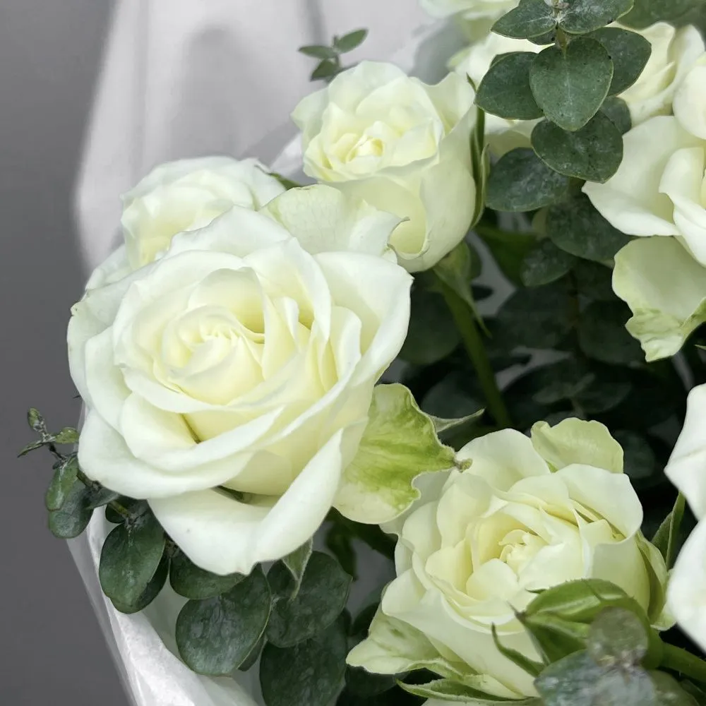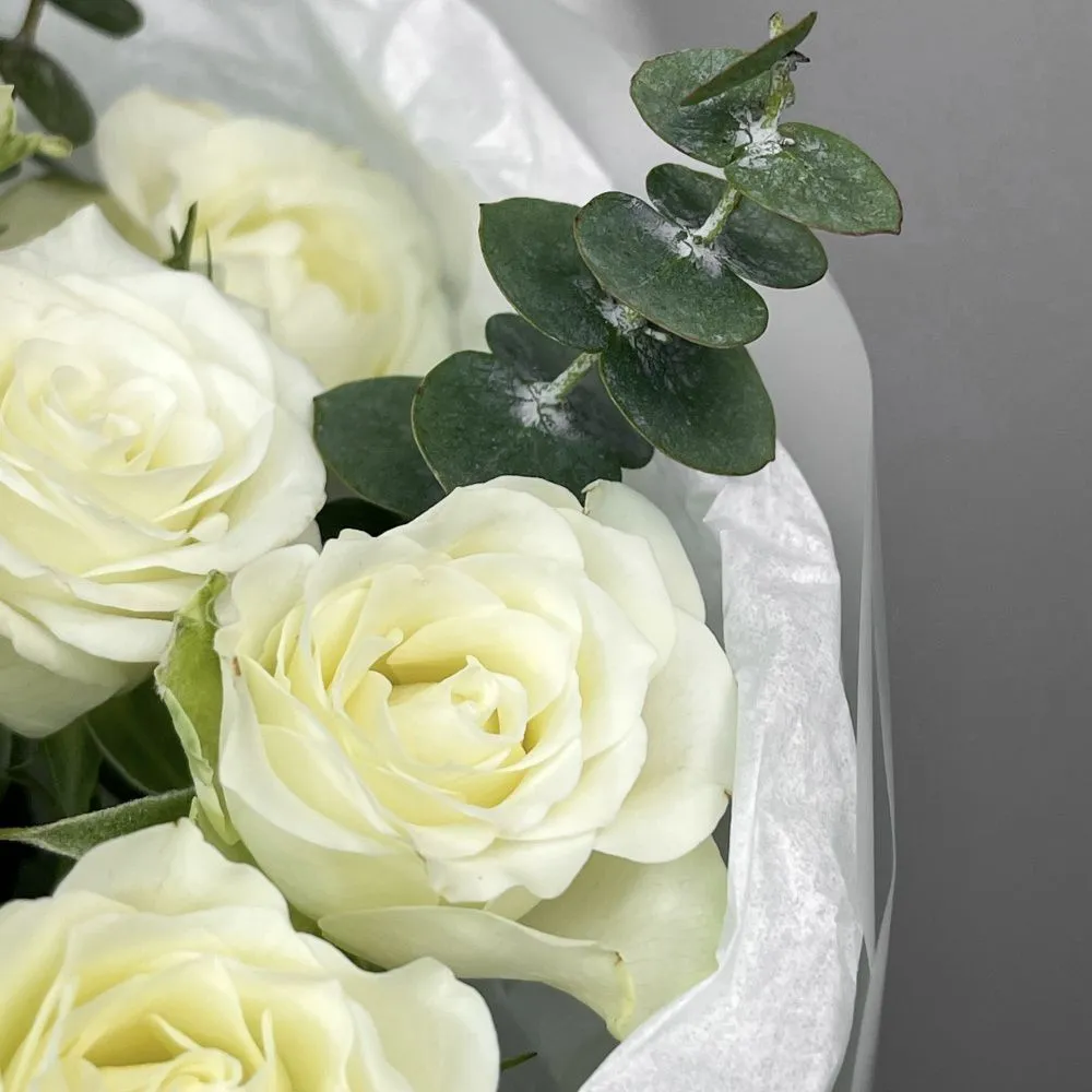 Состав: роза кустовая 9 шт., эвкалипт 2 шт. Букет из свежих цветов — идеальный способ выразить чувства: ко дню рождения, годовщине, 8 Марта, 14 Февраля, Дню матери, Дню учителя, Дню бабушки и дедушки или просто в знак внимания и заботы. Фирменная открытка-инструкция по хранению — в подарок. Цветочный букет — отличный подарок бабушке, маме, любимой женщине, жене, подруге, сестре, друзьям и коллеге.