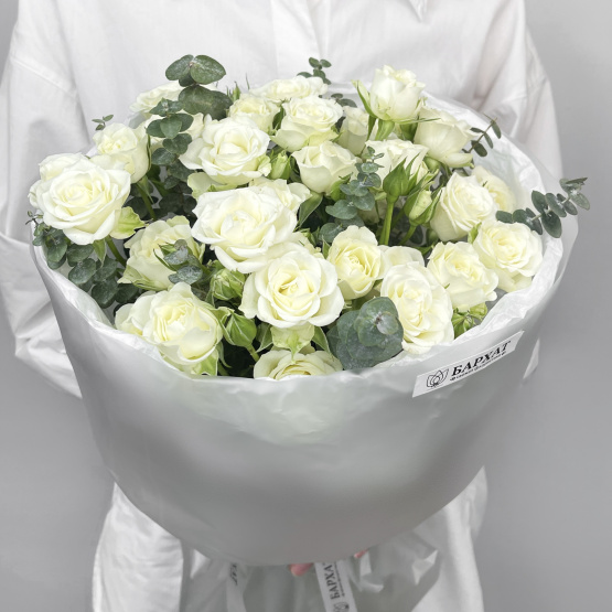 Состав: роза кустовая 9 шт., эвкалипт 2 шт. Букет из свежих цветов — идеальный способ выразить чувства: ко дню рождения, годовщине, 8 Марта, 14 Февраля, Дню матери, Дню учителя, Дню бабушки и дедушки или просто в знак внимания и заботы. Фирменная открытка-инструкция по хранению — в подарок. Цветочный букет — отличный подарок бабушке, маме, любимой женщине, жене, подруге, сестре, друзьям и коллеге.